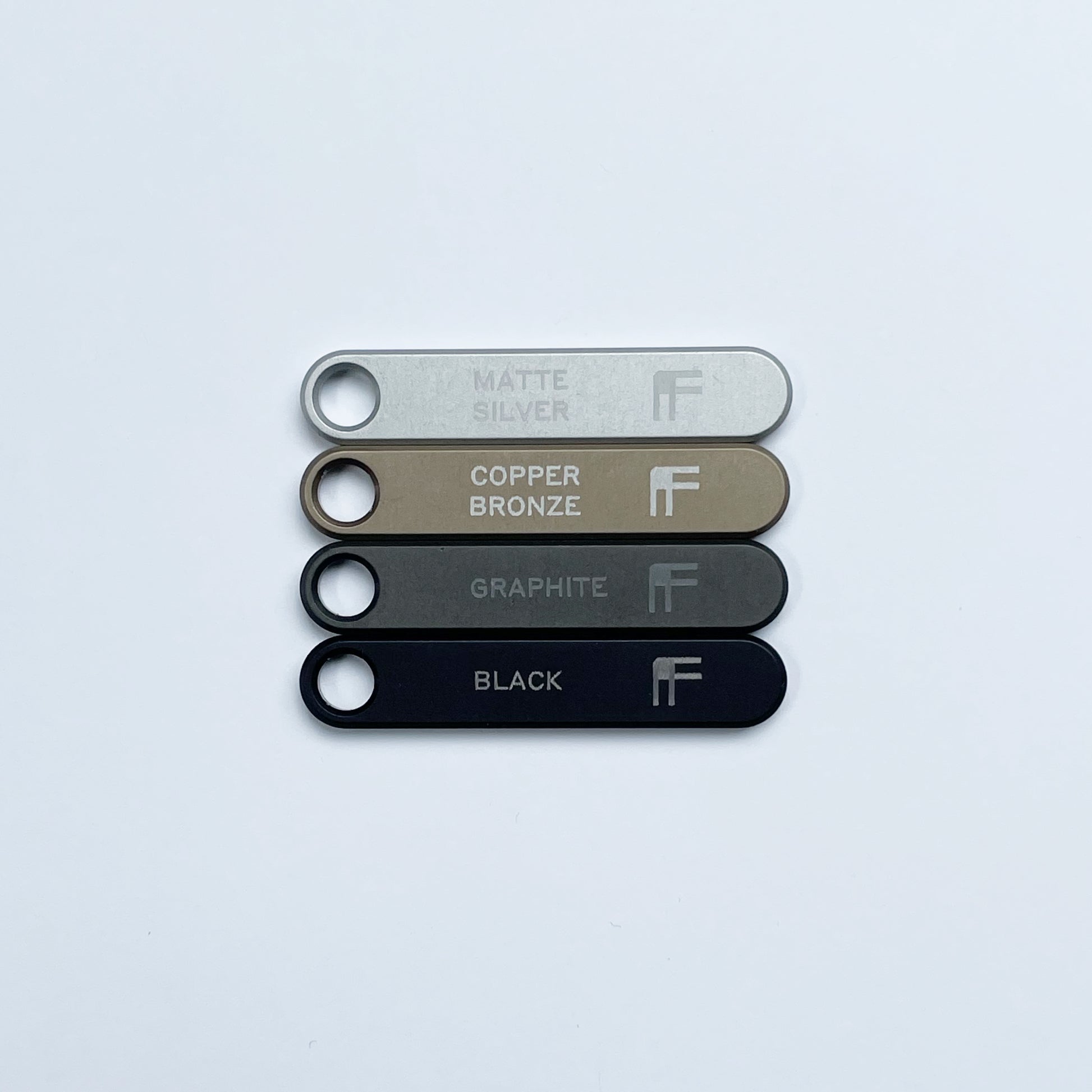 A set of four anodized aluminum samples: Matte Silver, Copper Bronze, Black and Graphite.